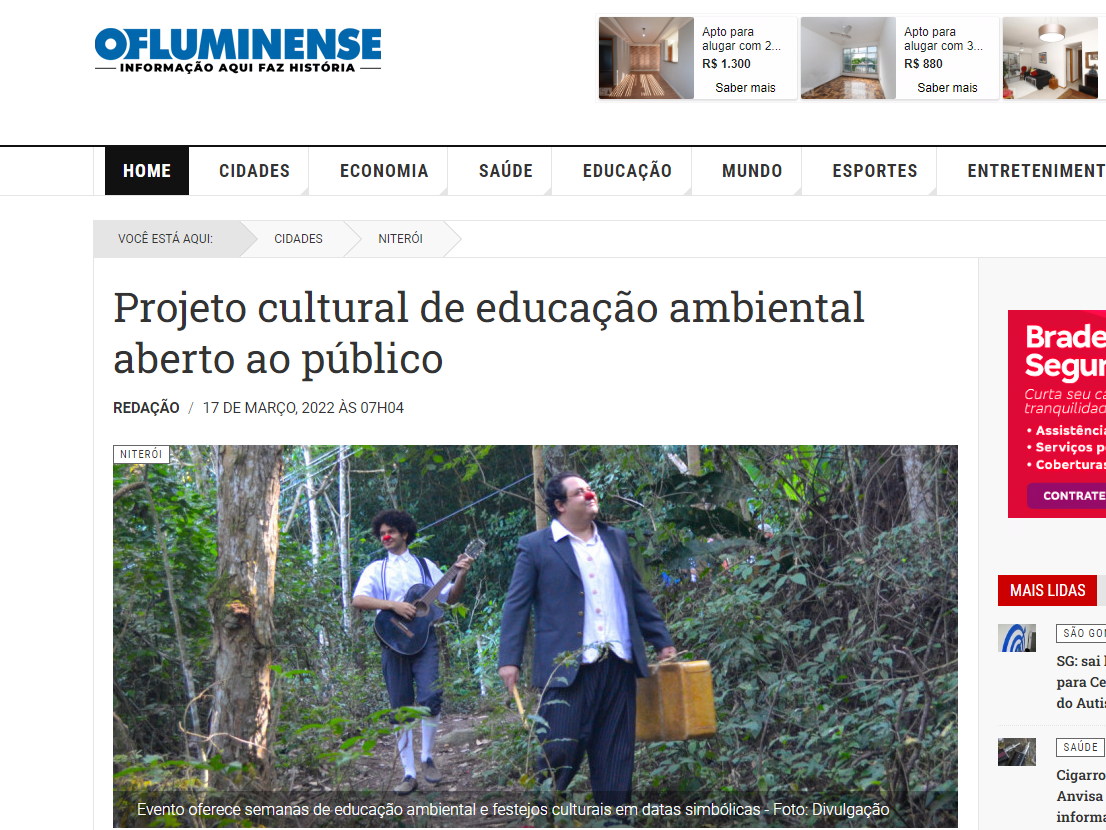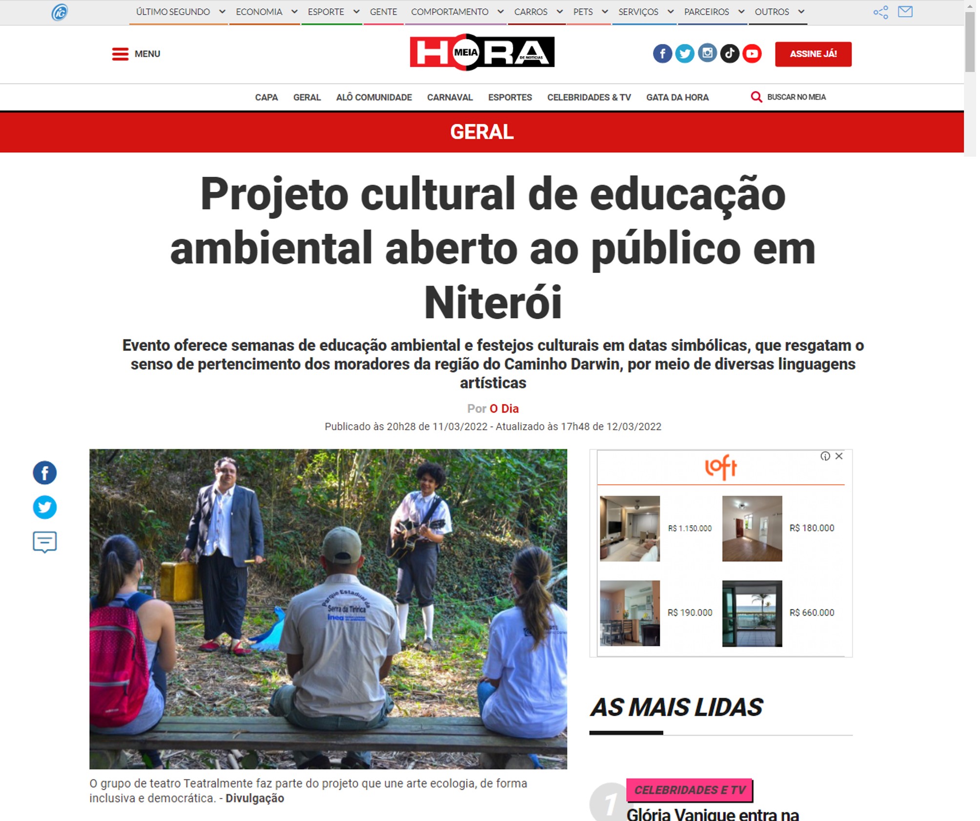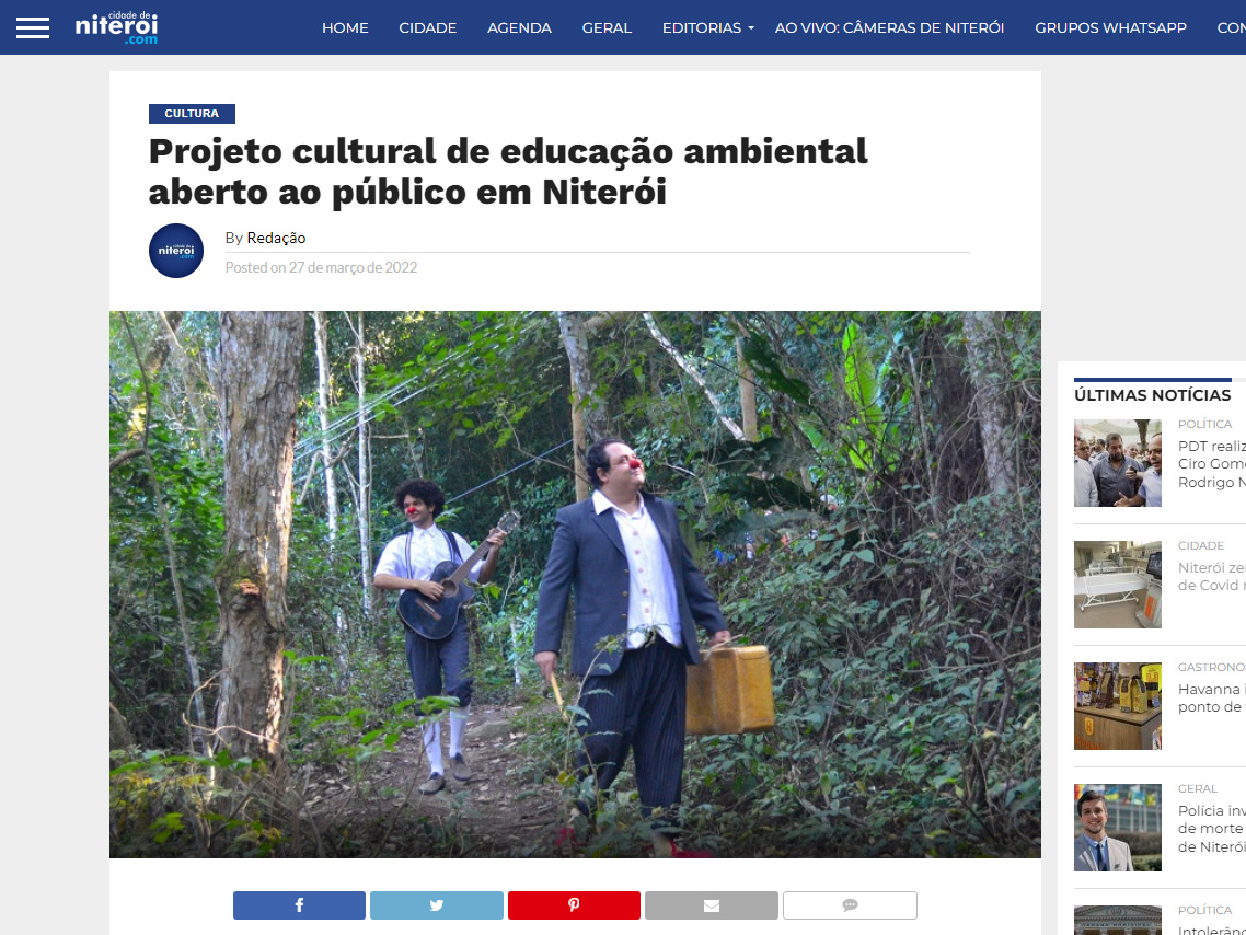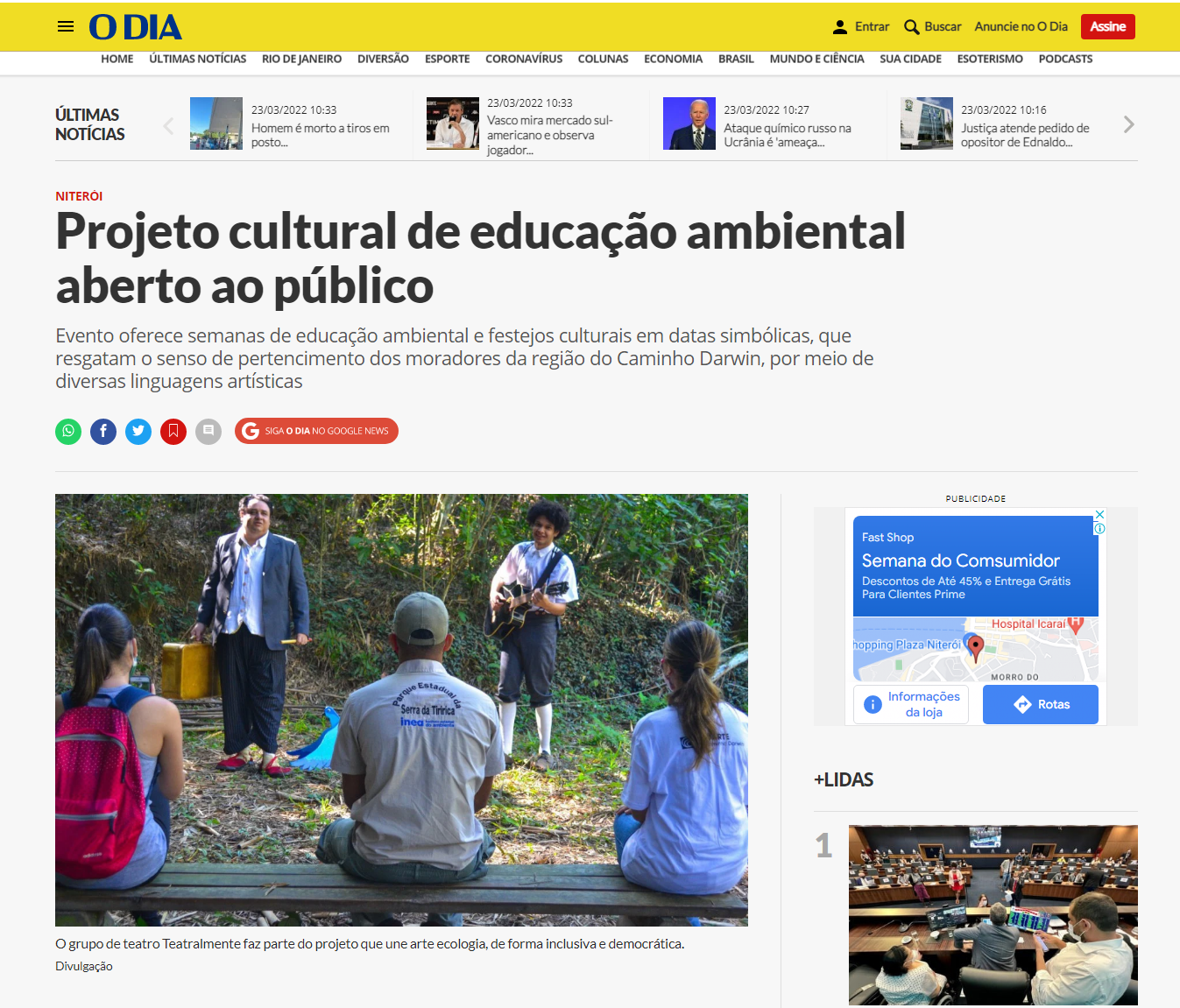 O Teatralmente está presente no projeto Ecoarte no Caminho Darwin. Uma realização da Ecoarte Produções e seus parceiros. Veja o clipping de algumas matérias jornalísticas sobre o projeto que saíram recentemente nos jornais O Globo, O Dia, Meia Hora, O Fluminense, A Tribuna e Cidade de Niterói. Imagens dos atores Fábio Rocha Pina e Júlio Augusto Torto em apresentações do espetáculo “Sobrevoar“.
